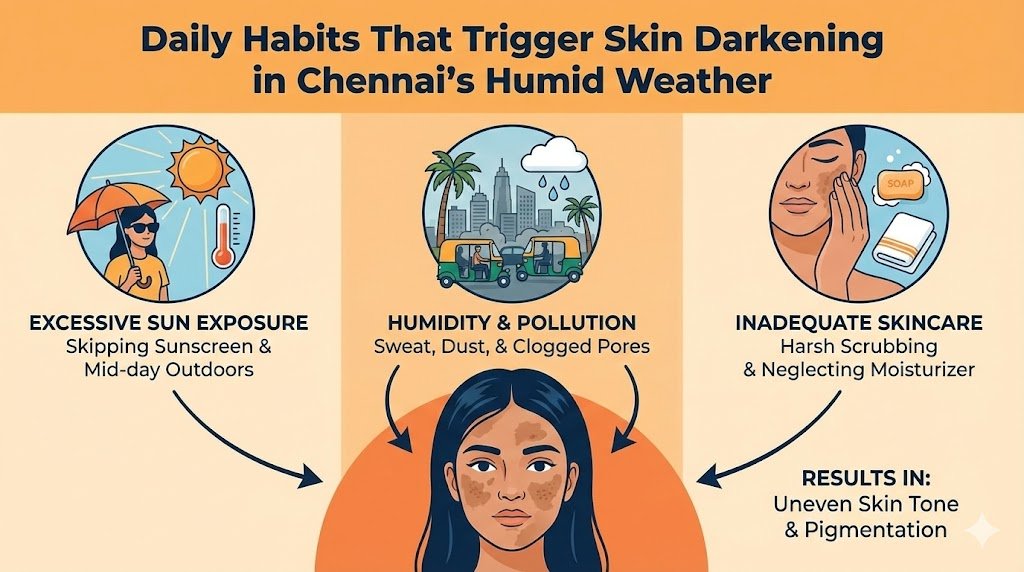 This blog explains how Chennai’s climate affects the skin, the daily habits that darken the tone, and what people can do to protect their natural radiance. It is written for individuals aged 18 to 60 who want safe, evidence-based care from skilled dermatologists and not quick-fix solutions. The aim is simple: help you understand what your skin faces in this weather and offer correct ways to manage it.